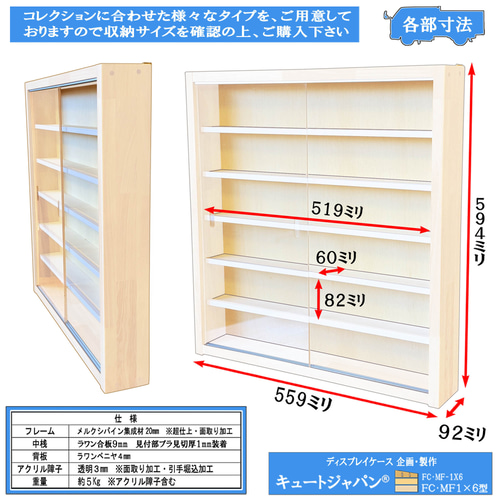 | 商品の特徴 | ミニチュア フィギュア コレクションケース ホワイト色塗装。ミニチュア フィギュア コレクションケース ホワイト色塗装。ミニチュアフィギュア コレクションケース ホワイト色塗装。【本体寸法】 巾559ミリ 高さ594ミリ 奥行92ミリ。【マス目寸法】 巾80ミリ 高さ104ミリ 奥行60ミリ。アクリル障子付の収納ケース 未使用製作品 MF6×5型です。アクリル障子は透明度が高く、大切なコレクションをホコリや傷から守ります。大切なコレクションを保管したい皆さまにご満足いただける一品と自負しております。外枠にメルクシパイン集成材・中桟にベニヤ(中桟正面は塗装仕上)を使用しています。外枠を合成樹脂ホワイト色塗装。重ね塗りのうえ研磨仕上をしています。お部屋のインテリアコーディネートに・・・。フィギュアが30個収納でき、コレクションをより一層惹きたてるディスプレイケースです。コレクター様に『こんなの欲しかった!』 そう言わせたい一心で製作しました。アクリル障子付ケースは3割を超える方がリピート(感謝!)されています。ありがとうございます。ご自身用に・・。プレゼントにもおすすめです。購入時の注意点:材料は建材を使用していますが、表面は天然木のため色目・木目・節の具合がその都度変わります。天然木独特のシミ・節目・割れ・接ぎがある場合がありますが、構造上問題はありません。製作では裏面の意匠は視覚的に重要視していません。ご了承ください。●スライド式障子は光線透過率93%の高品質アクリル板3ミリ厚を使用しています。引手加工をほどこしていますので開け閉め楽々です。●外枠に木目を活かしたパイン集成材を使用しています。長年お使いいただけるよう頑丈な造りとなっています。※中桟は固定式で可動はしません。サイズをご確認のうえご購入ください。※製品の一覧表を掲載しています。お探しの収納寸法がきっと見つかります。ご不明な点などご質問ください。ご購入された方の『コレ、また欲しい!』の嬉しいご感想を励み(ビタミン剤です!)にして、日々製作を行っております。製作・販売元 株式会社キュートジャパン#キュートジャパン#MF6×5型#一番くじ#ちょこのっこ#フィギュア#ガチャ#カプセルトイ#ミニチュア。フィギュア コレクション ディスプレイケース 30マス アクリル。ブルーアーカイブ 銀鏡イオリ 水着Ver. 1/7 完成品フィギュア。figma サムス・アラン ゼロスーツver. METROID Other M。ゼルダの伝説 ティアーズオブザキングダム FIGURIZMα“リンク” 9個。東方project チルノ フィギュア。【未開封】MARVEL VS. CAPCOM フィギュア。ゲームキャラクター figma Bloodborne The Old Hunter Edition。マコト=ナナヤ 1/7スケールフィギュア ブレイブルー。.*】様 モンハンフィギュア まとめ。アズールレーン プリンツ・オイゲン ファイナル・ラップVer. 1/7 完成品。【全種類】ギガスラッシュ フィギュアパック2 ドラゴンクエスト バトルゲーム。紅魔城伝説 レミリア・スカーレット 通常カラー 開封品 キューズQ。NieR:Automata Ver1.1a ポッド モデル テーブルランプ。一番くじ劇場版ハイキュー!! ゴミ捨て場の決戦2 値下げ交渉⭕️。CRISISCORE FINALFANTASYVII ザックスフィギュア。ソフィーのアトリエ。ド*ニ様 ドラゴンクエストサタンジェネラル ガレージキットリペイント塗装済みダー。メタルギア・ソリッド ピースウォーカーHDエディションプレミアムパッケージ。D-Arts ロックマンx フルアーマー フィギュア 11。ソフィーのアトリエ フィギュア ネグリジェver 1/6スケール スピリテイル。S.H.MonsterArts モンスターアーツ リオレウス モンスターハンター。アグネスタキオン フィギュア。ディズニーストア ラプンツェル 魔法の花 ランプ。[特典付]ブロッコリー GUILTY GEAR STRIVE 1/7 ブリジット。ポケモンセンターオリジナル figma ユウリ 新品未開封。CAPCOM フィギュアビルダー クリエイターズモデル 怨虎竜 マガイマガド。R*G様 原神 神里綾華 白鷺氷華Ver. フィギュア 特典付き! 新品! 未開。【超希少】ファイナルファンタジー4 試練の山 コールドキャストコレクション。BUZZmod. NieR:Automata Ver1.1a 2B フィギュア | ||